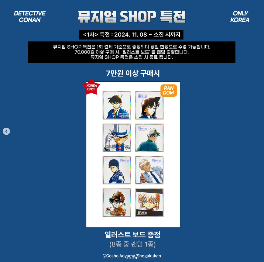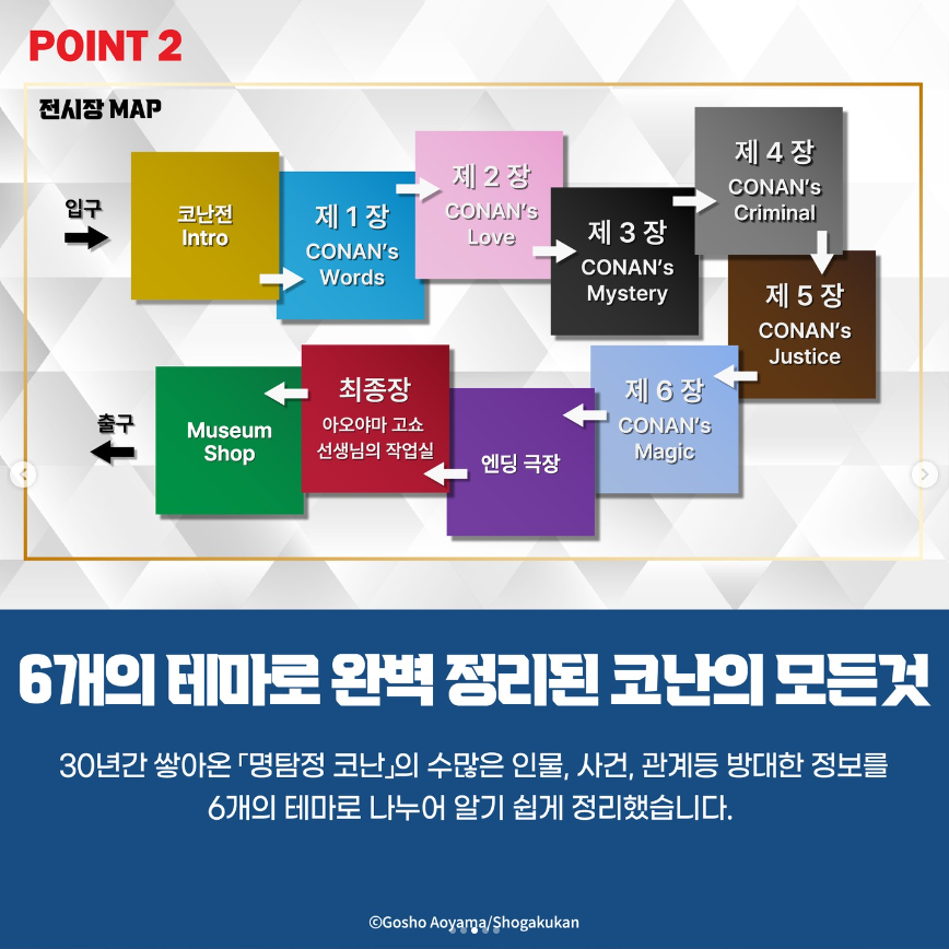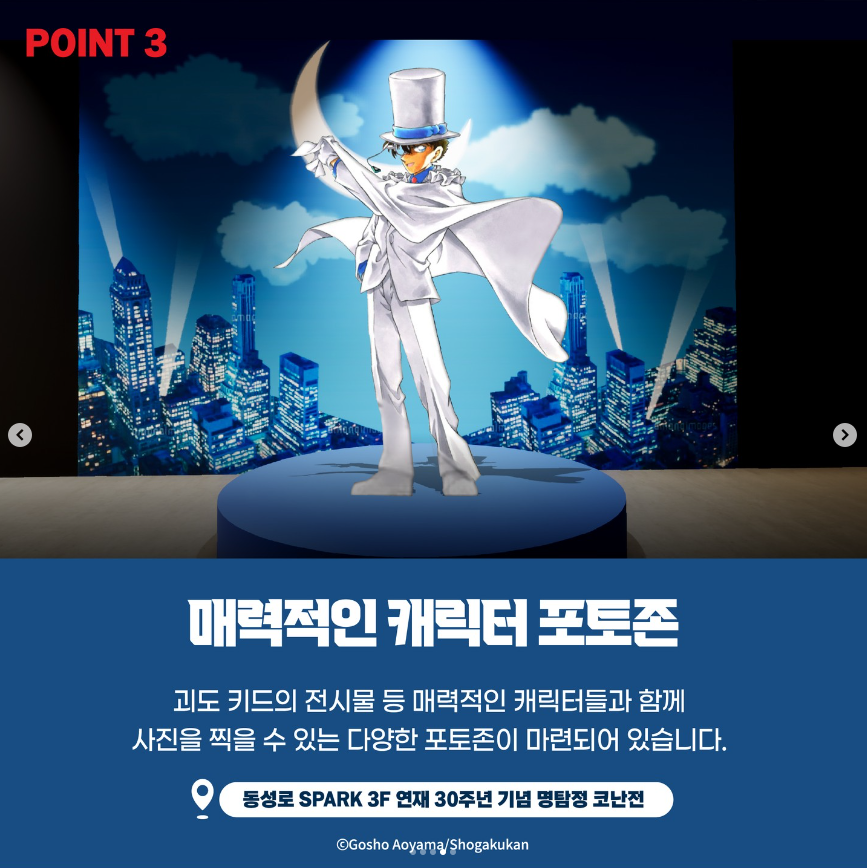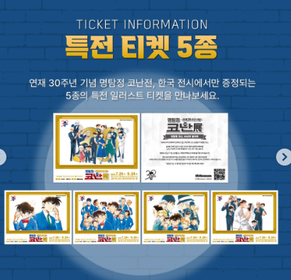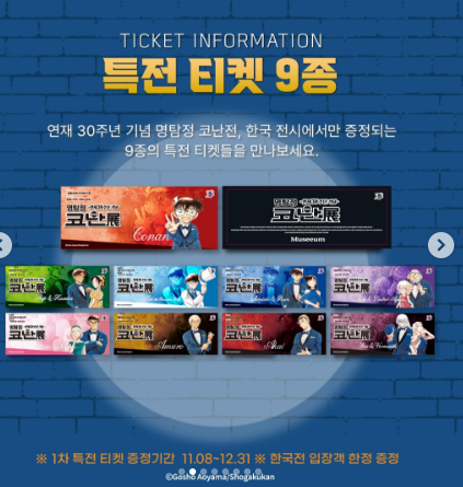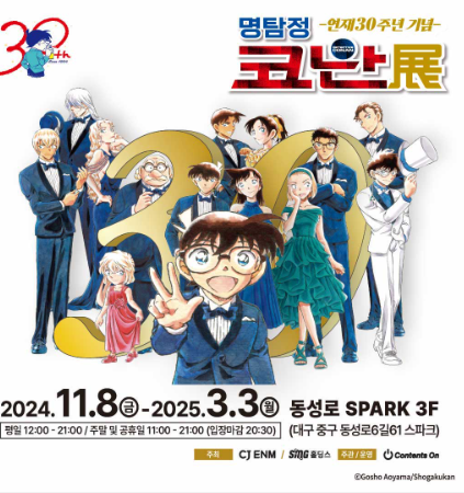 서울에서 열렸던 명탐정 코난전이 11월 8일부터 뮤씨엄 대구에서 진행됩니다. 명탐정 코난전은 올해 연재 30주년을 맞이하여 6개의 테마로 코난의 모든 것을 알아볼 수 있는 전시회입니다. 전시 티켓은 온라인과 현장에서 구매 가능하며 전시 기간에 따라서 전시 특전이 주어집니다. 전시회에서만 볼 수 있는 특별영상부터 캐릭터들과 사진을 찍을 수 있는 포토존까지! 즐길 것이 다양한 코난전에 놀러오세요!