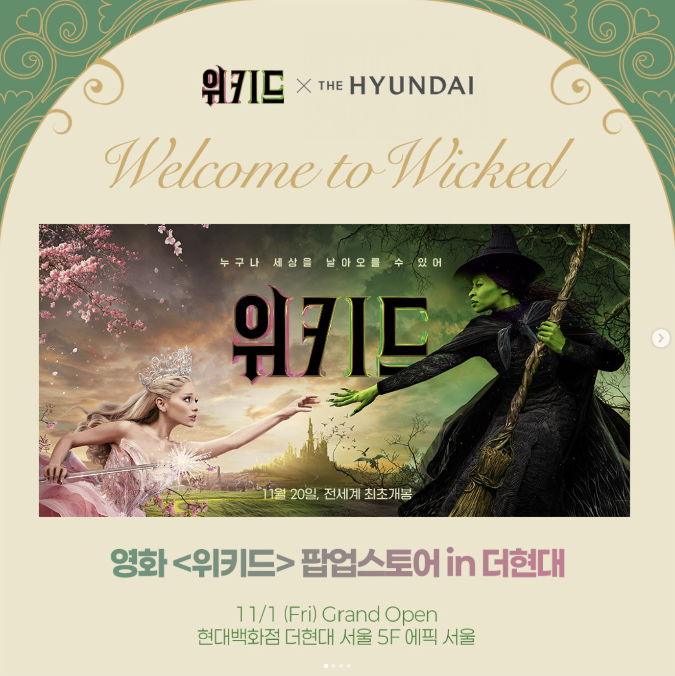 11월 1일 금요일부터 12월 1일 일요일까지 더현대 서울 5층 에픽 서울에서 영화 위키드 팝업스토어가 운영됩니다. 현재 1차 사전예약 링크가 오픈하였으니 관심있으신 분들은 확인하시면 될 것 같습니다. 이번 팝업스토어에서는 위키드 한정상품들도 구매가 가능하다고 합니다. 관련해서는 유니버셜 픽쳐스 공식 SNS를 통하여 안내된다고 하니 공지도 잊지 마세요!