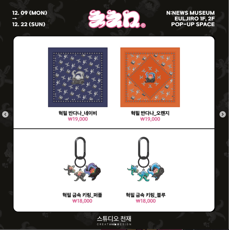 2025 침투부 일력, 포토게임 카드_OOTD of 침착맨(3개입 랜덤 / 총 78종 + ∝), 카드바인더, 모자 키링 파우치, 빵애에요 음성 인형, 혁필 모티브 자수 "스카잔" (한정 수량), 혁필 "후드 4종" (후드 집업 침착 [자수] / 후드 독깨팔 [프린팅] / 후드 베이직 [자수] / 후드 침착 [자수]), 혁필 "반다나", 혁필 모티브 ㅊㅊㅁ 에셋 컬러와 찰떡인 "금속 키링", 가볍고 실용적인 힙한 혁필 "짐색", "와신상담"(臥薪嘗膽) 패브릭 포스터