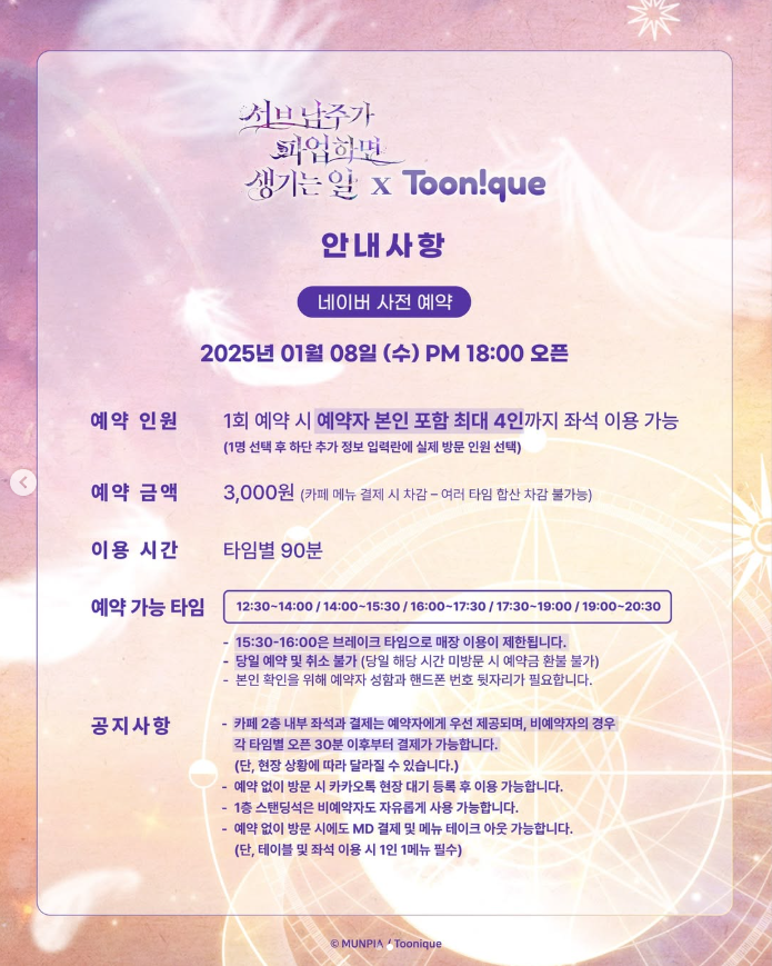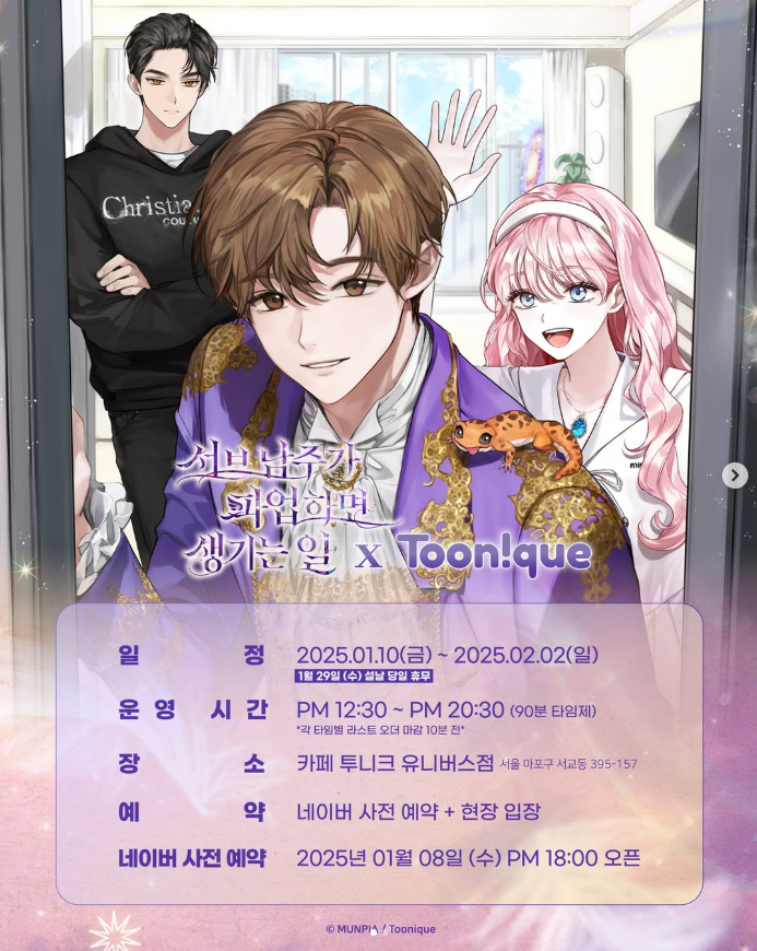 네이버에서 볼 수 있는 웹소설인 서브 남주가 파업하면 생기는 일에 관하여 알고 계신가요? 저는 웹툰으로 이 작품을 접하게 되었는데요. 웹툰은 현재 연재 중이라서 보다가 바로 웹소설로 넘어와 완결까지 후루룩 재밌게 읽은 작품입니다. 최근에 본 웹소설 중에서는 단연 1등인 것 같습니다. 카페 투니크에서 서브 남주가 파업하면 생기는 일 콜라보 카페를 진행한다고 하는데요. 너무 좋아하는 작품이라서 꼭 방문해보고 싶습니다. 1월 8일에 사전 예약이 진행되고 입장은 사전 예약과 현장 입장 동시에 진행된다고 합니다. 서브 남주가 파업하면 생기는 일에 관심이 있으신 분들이라면 이번 콜라보 카페 방문해보시는 것은 어떨까요?