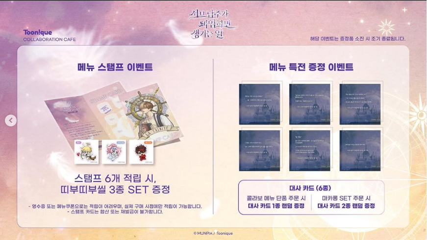 - 콜라보 메뉴 단품 주문 시 대사 카드 1종 랜덤 증정