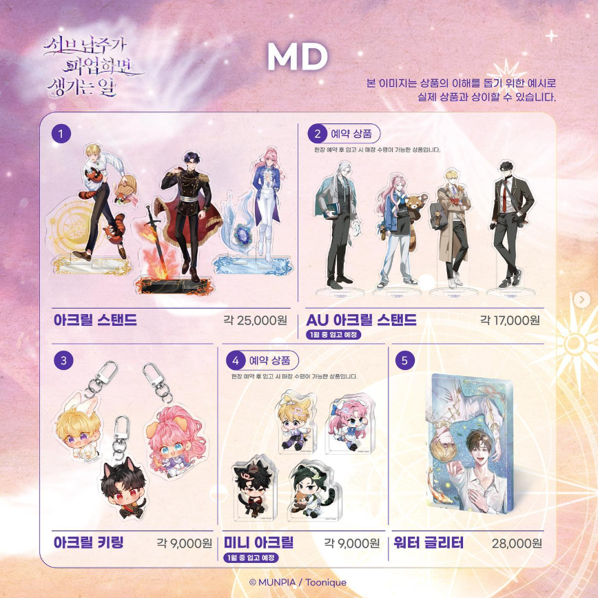아크릴 스탠드, AU 아크릴 스탠드(예약 상품), 아크릴 키링, 미니 아크릴(예약 상품), 워터 글리터, 마우스 패드 세트, 예서의 수첩 세트, 애물단지 금속 뱃지 세트, 양면 일러스트 엽서 세트, 쌍성의 맹약 패키지(성약 서약서, 편지지 2종, 금속 책갈피)