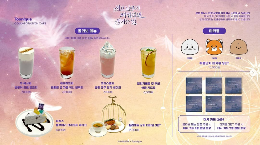 두 예서의 쌍둥이 타로 밀크티, 세트리크의 로메로 궁 자몽 허니 블랙티, 크리스텔의 분홍 공주 딸기 쉐이크, 엘리자베트 경 추천 애플 시드르, 피시스 블루베리 크레이프 케이크, 쥘리에트 궁의 티타임 SET, 애물단지 마카롱 SET